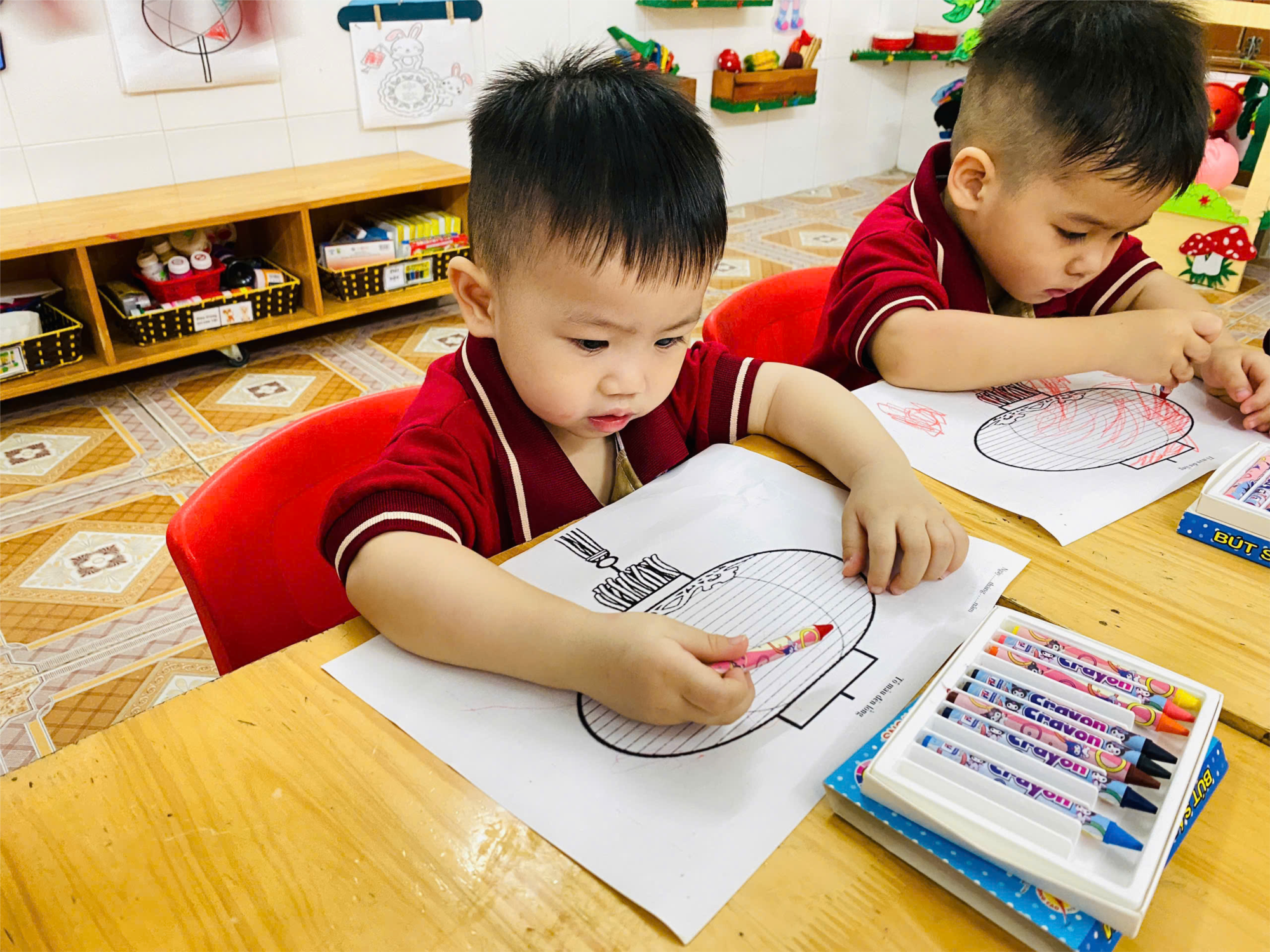 Sau đây là một số hình ảnh trong hoạt động: Tô màu đèn lồng của các bé Lớp Nhà trẻ 2