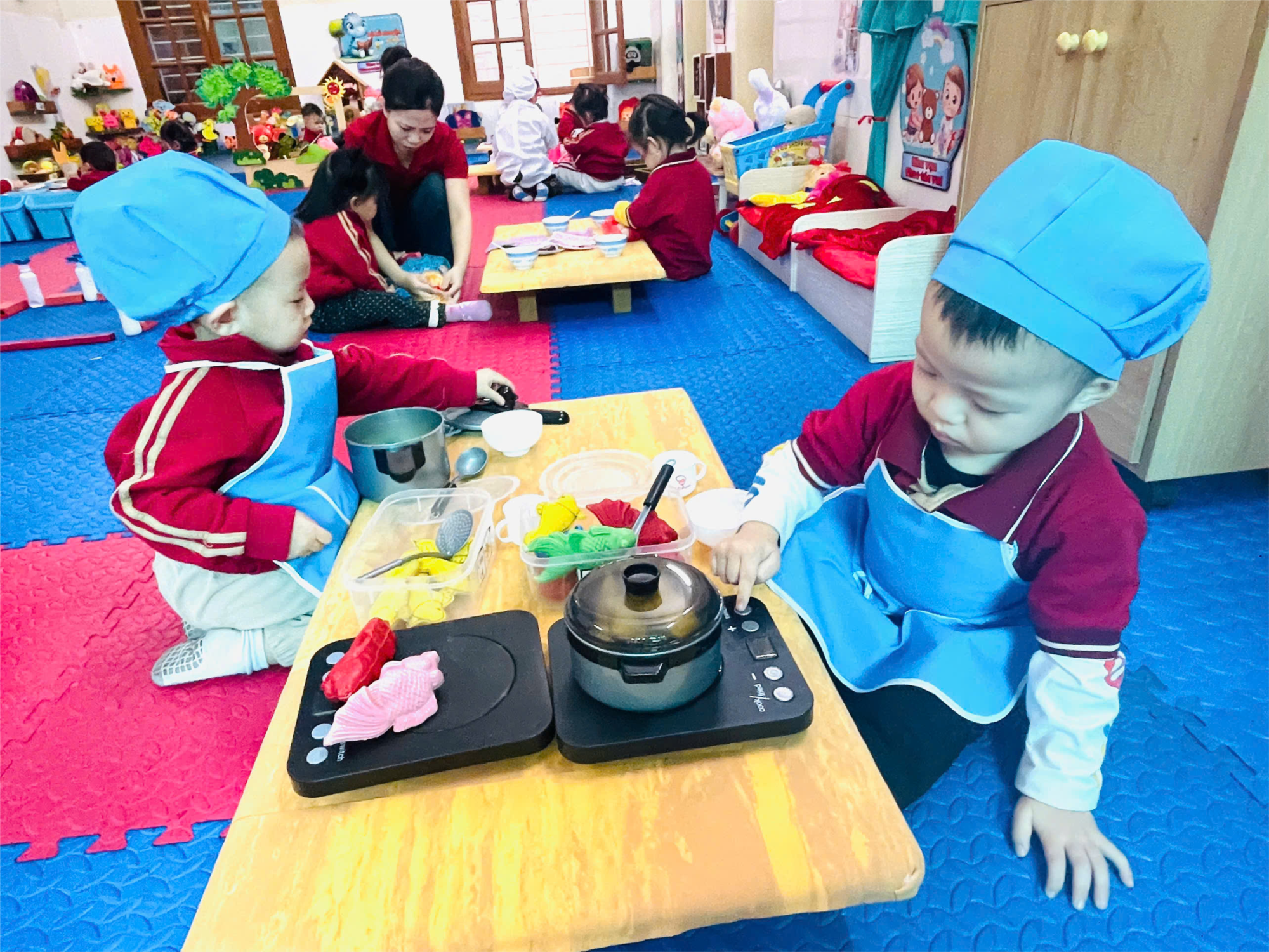 Mỗi khu vực chơi trong lớp học đều được cô chuẩn bị chu đáo với nhiều đồ dùng, đồ chơi phong phú và hấp dẫn. Các bé được rèn luyện kỹ năng giao tiếp, khả năng hợp tác khi cùng nhau chơi; biết chia sẻ, giúp đỡ bạn bè và thể hiện sự sáng tạo qua từng hoạt động. Không khí trong lớp luôn rộn ràng, vui tươi. Bé nào cũng hào hứng, say mê nhập vai có bé làm hoạ sỹ, bé làm bác sĩ, bé lại làm người nấu ăn… Qua đó, các con vừa học mà chơi, chơi mà học, phát triển toàn diện về trí tuệ, ngôn ngữ, tình cảm và kỹ năng sống. Hoạt động tại các khu vực chơi trong lớp học thật sự là " Thế giới thu nhỏ" giúp các bé lớp Nhà trẻ 2 khám phá, sáng tạo và trưởng thành mỗi ngày.