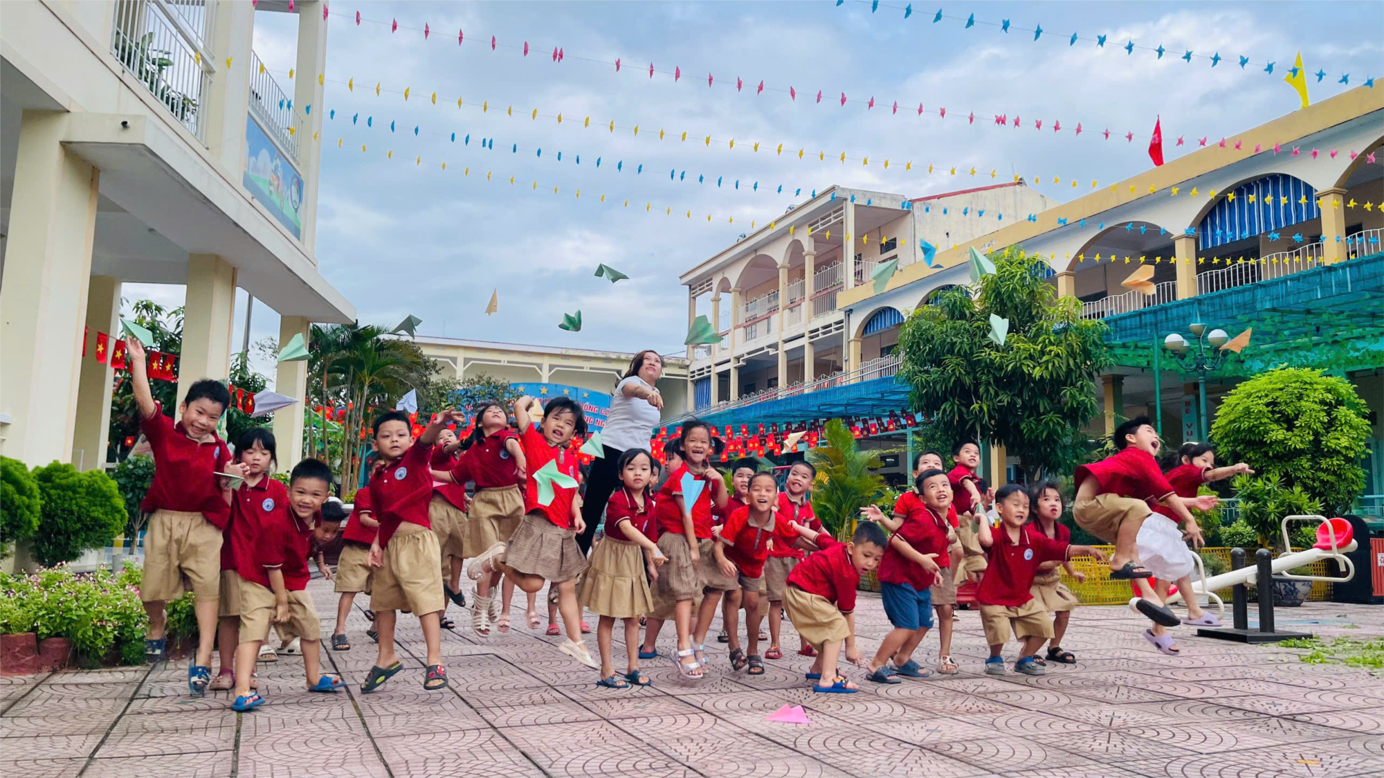 Hôm nay trong giờ hoạt động ngoài trời, cô và các bé lớp MG 5A3 cùng nhau quan sát các cô bác lao công đang cắt tỉa cây, nhổ cỏ để vườn trường thêm xanh – sạch – đẹp. Trẻ chăm chú quan sát, trò chuyện, lắng nghe... biết được công việc của cô lao công rất ý nghĩa và học cách giữ gìn môi trường trường lớp luôn xanh - sạch đẹp. Có bạn còn thì thầm: “Cô lao công làm sân trường mình đẹp quá!”. Các bé đã cùng nhau giúp cô thu nhặt lá cây bỏ vào thùng rác... Sau đó, không khí trở nên thật sôi động với trò chơi “Mèo đuổi chuột”. Tiếng cười giòn tan vang khắp sân trường - các bé chạy nhanh nhẹn, khéo léo, cổ vũ nhau rất hào hứng. Kết thúc trò chơi, các con được thỏa sức sáng tạo với phần chơi tự do: gấp và thả máy bay giấy. Những chiếc máy bay bé nhỏ tung bay trong gió, mang theo niềm vui và sự háo hức của tuổi thơ. Ánh mắt bé nào cũng lấp lánh niềm vui sau một buổi hoạt động đầy ý nghĩa.