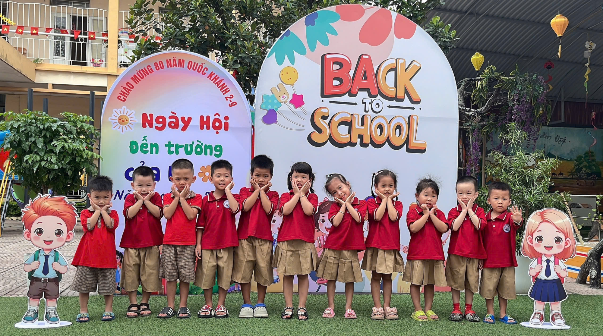 Ngay từ sớm, phụ huynh và các bé háo hức trong những bộ quần áo đẹp, rạng rỡ nụ cười đến trường. Khuôn viên được trang hoàng rực rỡ cờ, hoa. Các cô giáo ân cần đón trẻ.