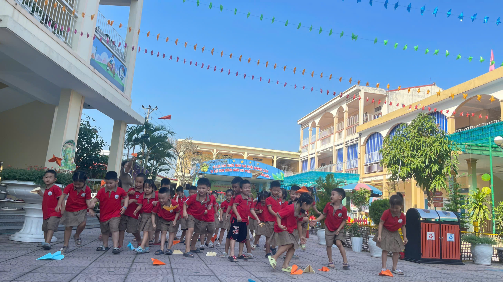 Ngoài ra các con còn được tự do chơi các trò chơi ngoài trời như chơi cầu trượt, xích đu,…ngay tại chính ngôi trường của mình trong không khí trong lành và thân yêu.
