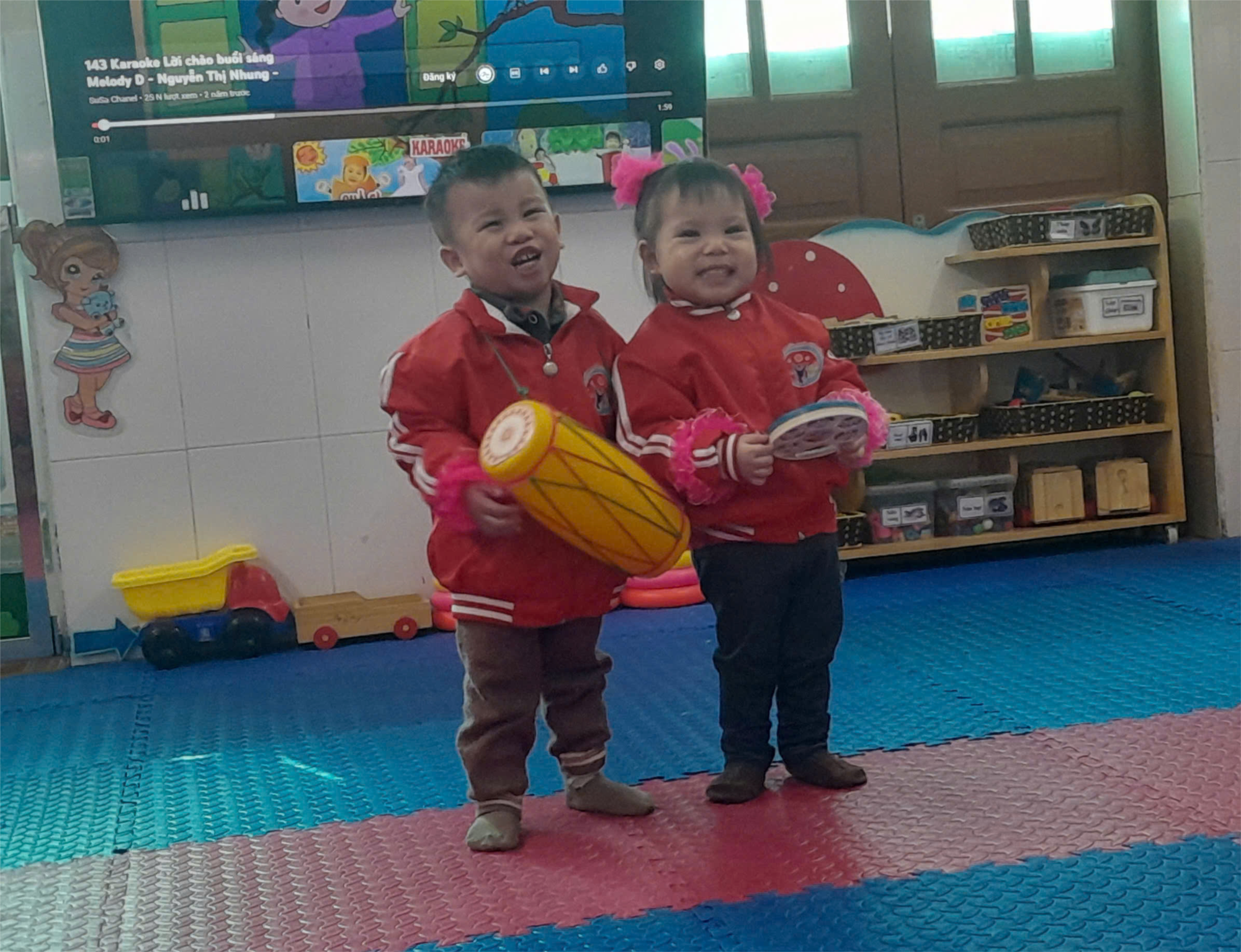 Các cô giáo đã chuẩn bị chu đáo nhiều nhạc cụ âm nhạc khác nhau cho trẻ: Phách tre, trống, sắc xô...để gây hứng thú thu hút trẻ vào giờ học.Trẻ vận động theo nhạc, biết phối hợp âm nhạc với nhịp điệu một cách say sưa. Trẻ vừa hát vừa vận động theo nhạc giúp trẻ biết cảm nhận về âm nhạc từ đó giúp cho trẻ phát triển vốn từ phong phú, đa dạng hơn.