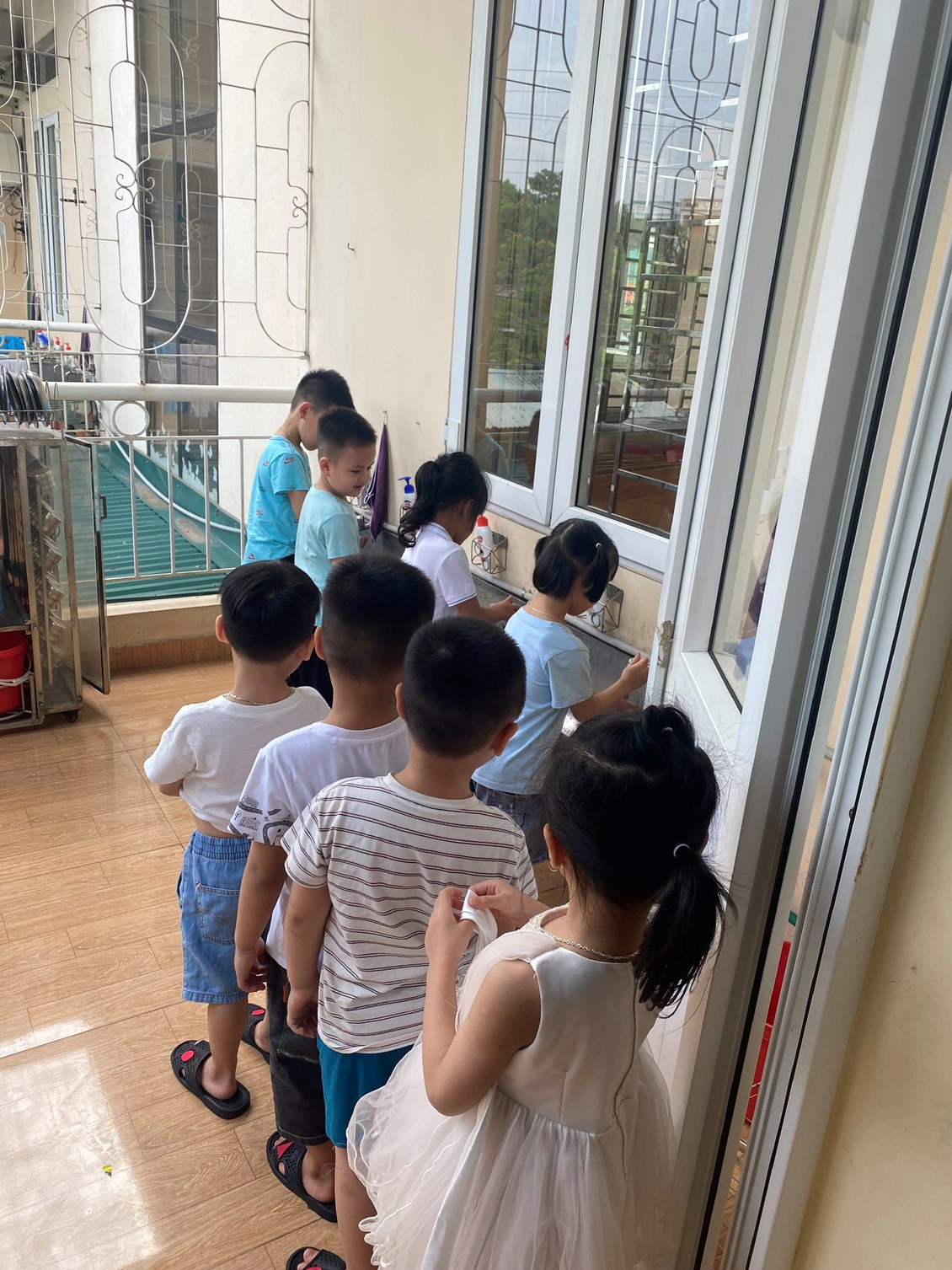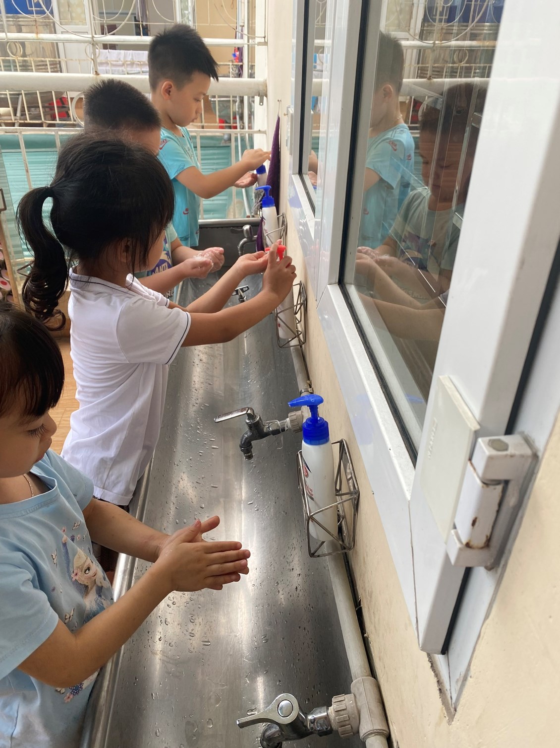 Các bé xếp hàng rửa tay