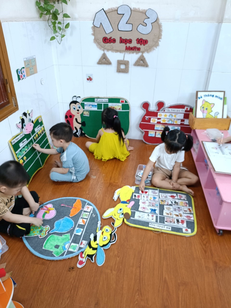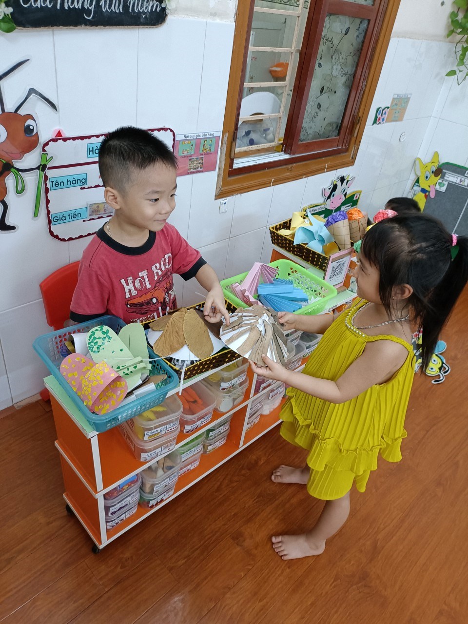 Cô và trẻ làm đồ chơi trong góc nghệ thuật