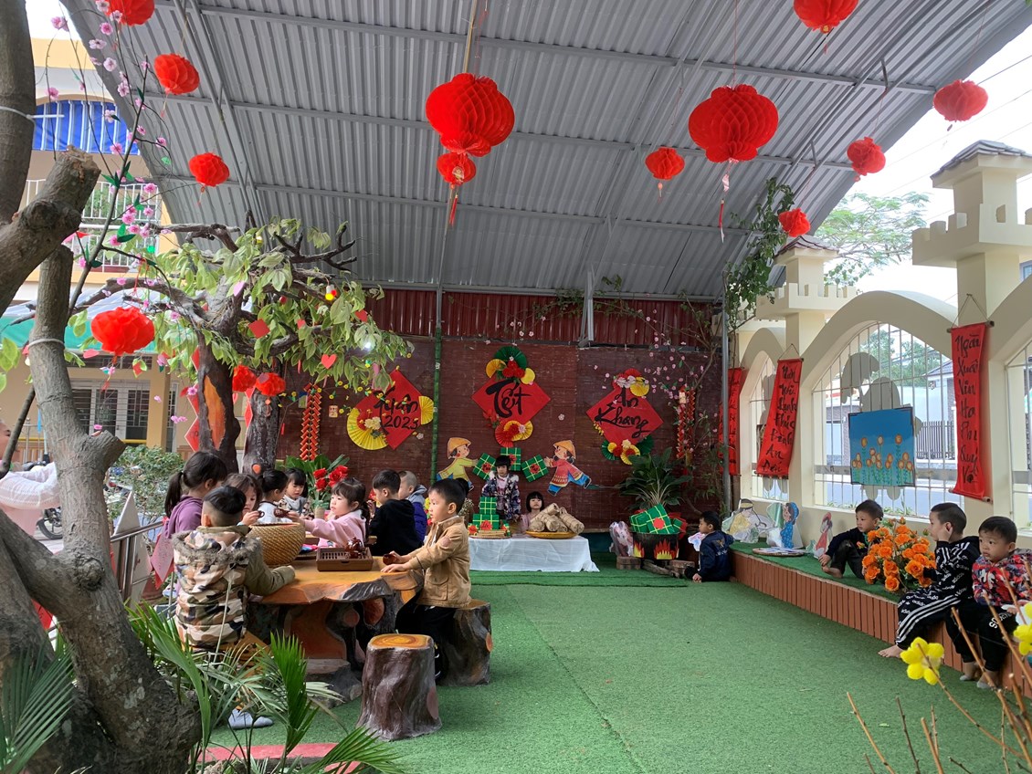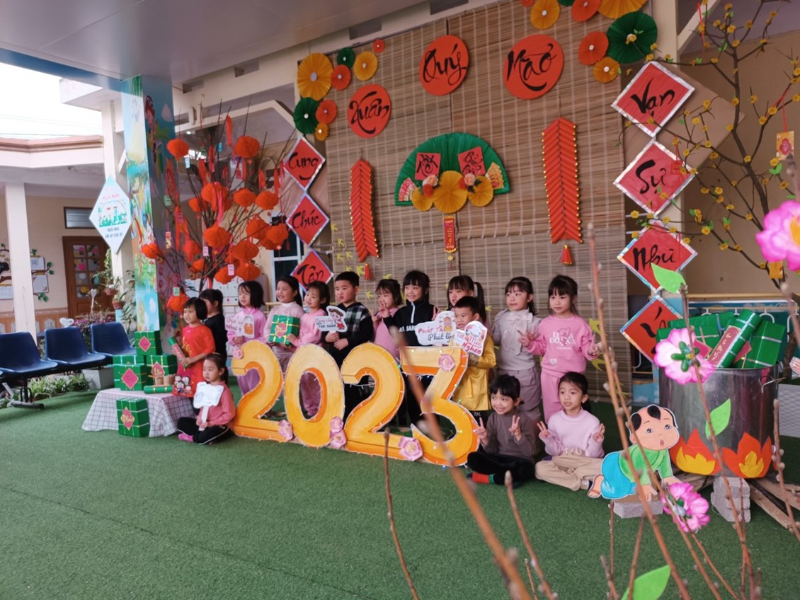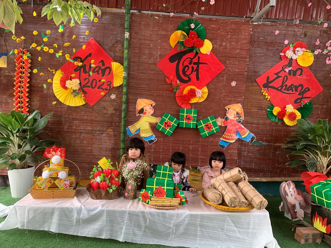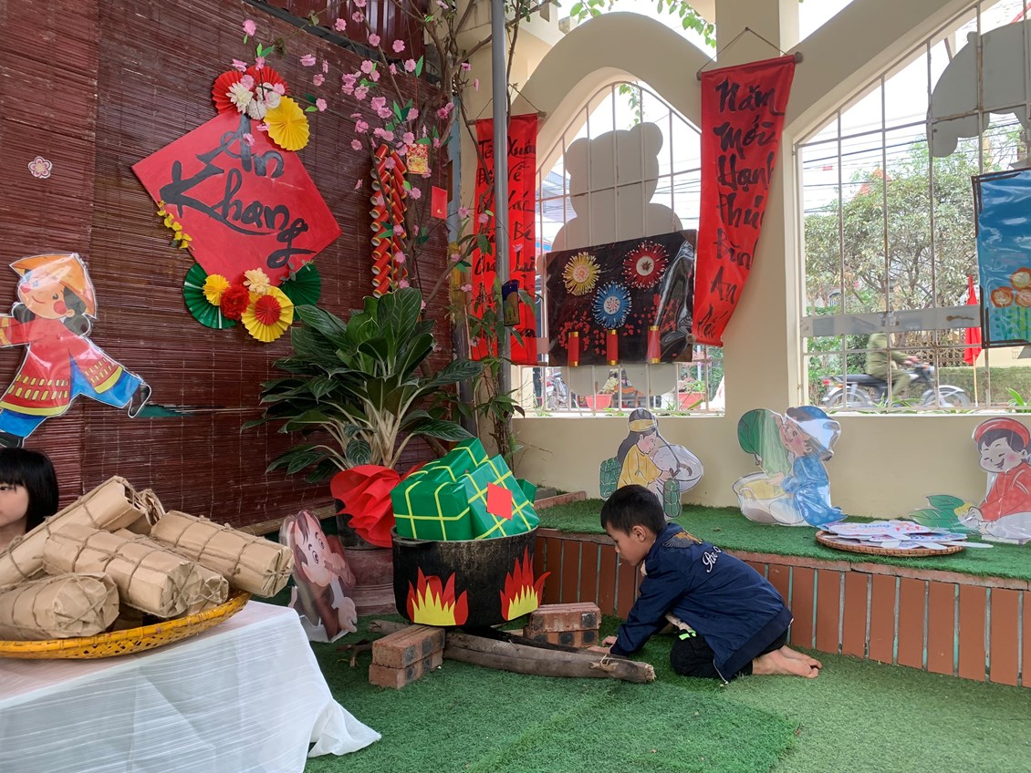 Để giúp trẻ mầm non hiểu rõ về ý nghĩa của việc gói bánh chưng trong ngày tết cổ truyền của dân tộc Việt Nam chúng ta. Một số nhóm lớp đã tổ chức hoạt động trải nghiệm cho trẻ như xây dựng môi trường , gói bánh chưng. Hay một số hoạt động ý nghĩa như: Chơi các trò chơi dân gian, bán hàng tết, múa hát mừng xuân, trang trí cành đào, cành mai….