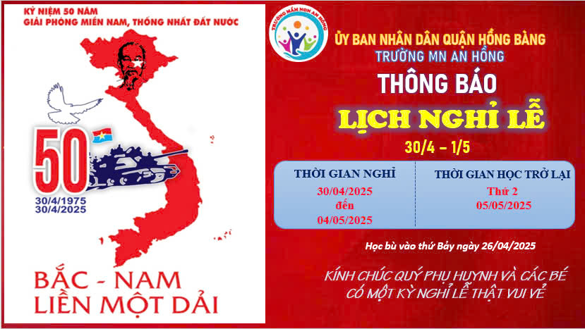 Trường Mầm non An Hồng xin trân trọng thông báo tới quý Phụ huynh lịch nghỉ lễ ngày 30/4 và 1/5/2025 như sau: Các Bé bắt đầu nghỉ học từ thứ 4 (ngày 30/4/2025) đến hết ngày 4/5/2025 (chủ nhật) và đi học trở lại vào ngày 5/5/2025 (Thứ 2). Nhà trường dạy bù vào thứ 7 (ngày 26/4/2025)