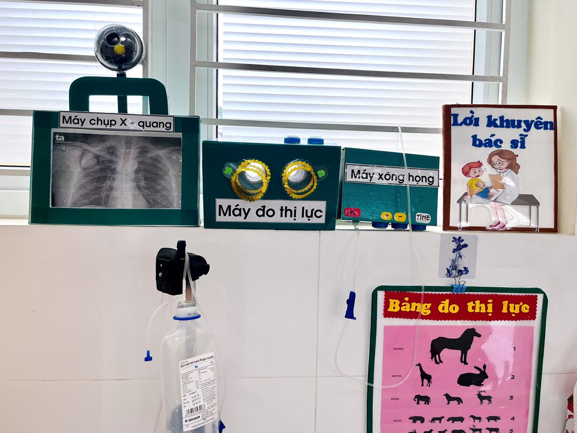 Để tham gia trò chơi này cô và bé đã cùng nhau chế tạo tạo ra một góc chơi với đây đủ đồ dùng hiện đại với các loại máy: Máy đo nhịp tim, máy đo thị lực, máy chụp X- quang,...