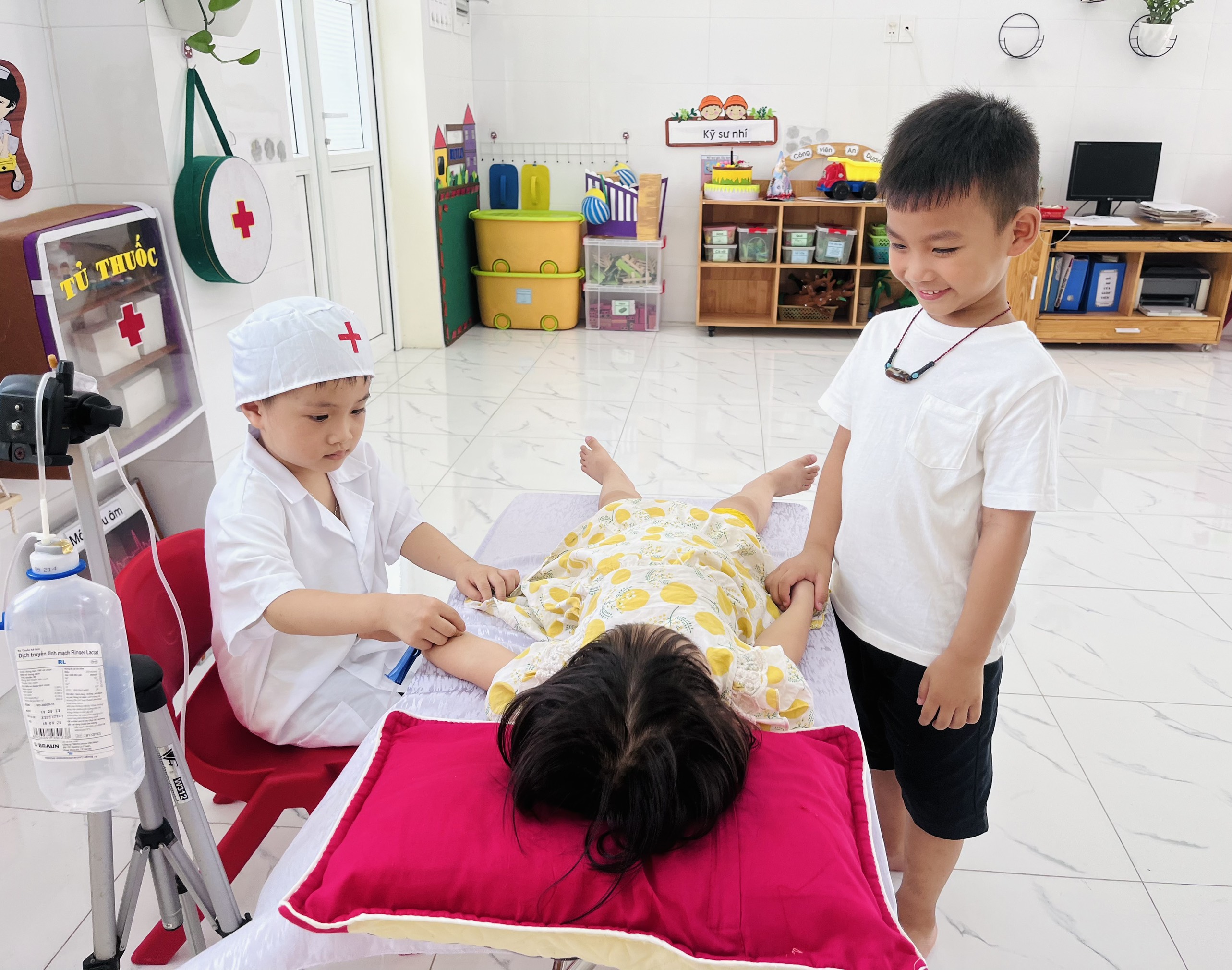 Cho một bé đóng vai bệnh nhân, các bé còn lại trong lớp sẽ đóng vai bác sĩ và y tá. Khi bác sĩ khám cho bệnh nhân thì y tá sẽ phụ giúp, làm theo các chỉ dẫn từ phía bác sĩ, còn bệnh nhân sẽ phục tùng các ý kiến của bác sĩ và y tá đưa ra. Được hóa thân trong vai trò làm bác sĩ, y tá, các bé sẽ ý thức về cách làm chủ tình huống, khi trẻ đến bệnh viện sẽ ý thức được vai trò của mình vì mọi thứ đều được tái hiện lại rõ ràng trong trò chơi.