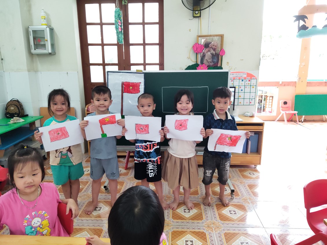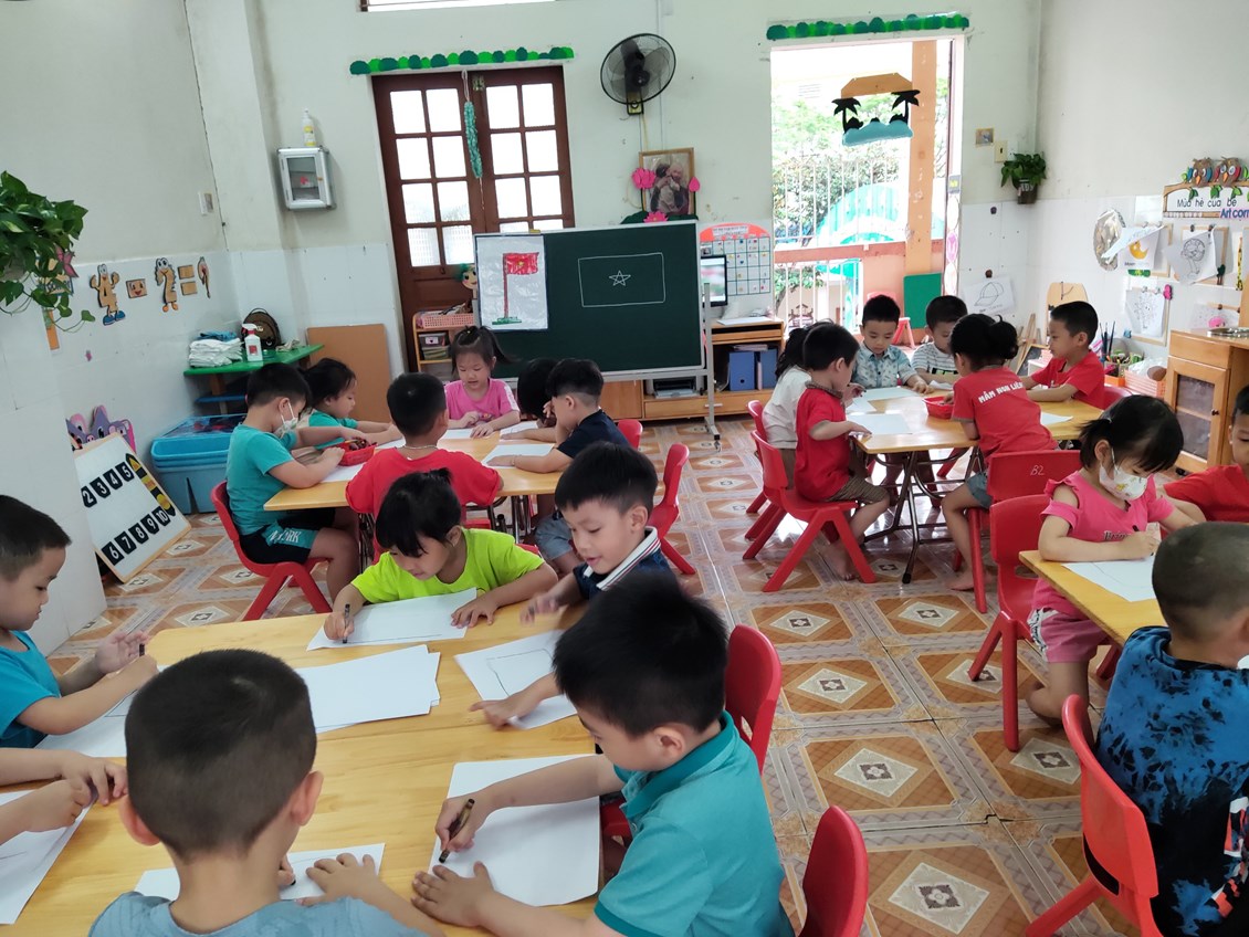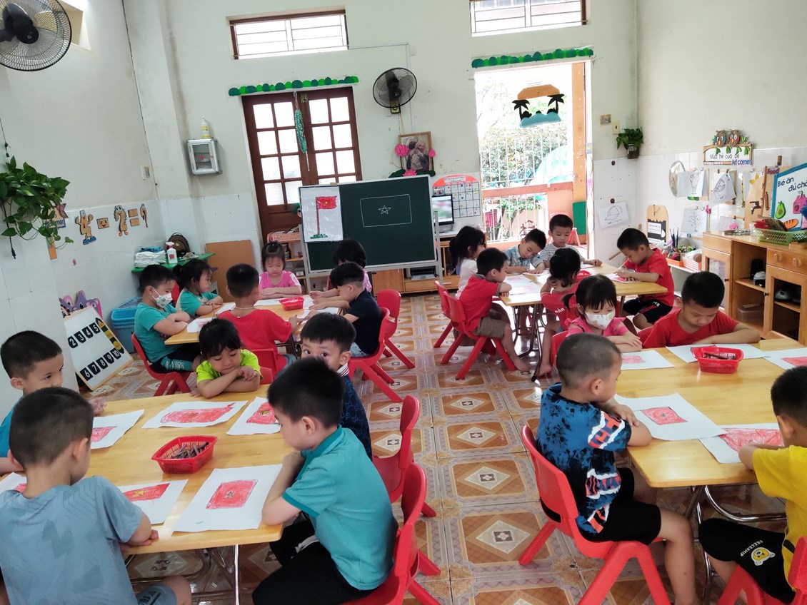 Sau khi được cô giáo hướng dẫn tỉ mỉ cách vẽ lá cờ tổ quốc, các con bắt đầu vẽ một cách say mê.