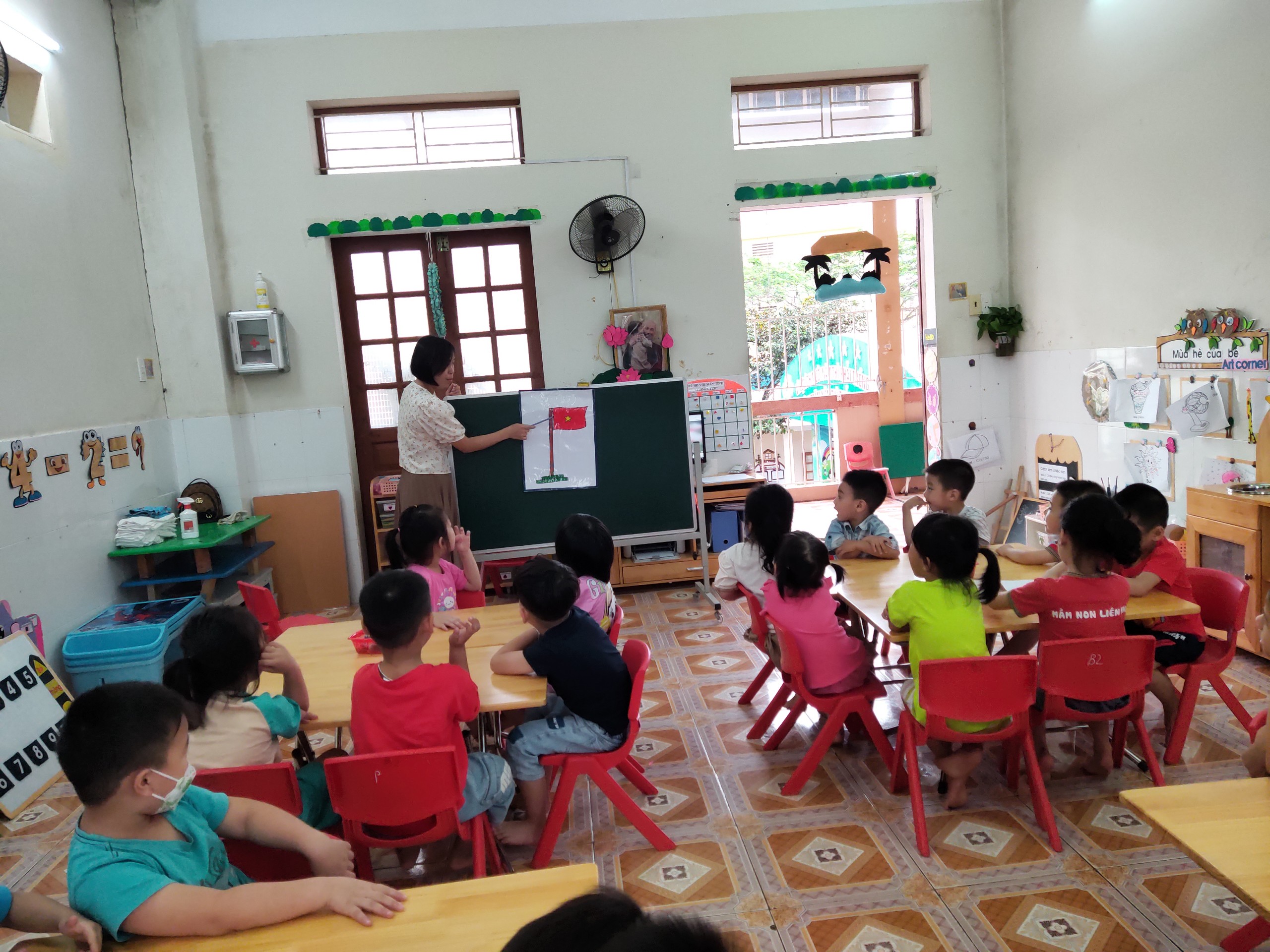 Lá cờ đỏ sao vàng là biểu tượng, là niềm tự hào dân tộc của mỗi người dân Việt Nam. Và ngày hôm nay, các cô giáo lớp mẫu giáo 4B3 cũng đã giới thiệu cho các bé về lá cờ Tổ Quốc. Qua đó trẻ có một số hiểu biết về biểu tượng lá cờ Việt Nam ( Cờ đỏ sao vàng) , cảm nhận được vẻ đẹp và ý nghĩa của lá cờ. Các bé được vẽ, được tô màu lá cờ đỏ sao vàng, bạn nào cũng tô đúng màu và đẹp mắt. Chúng mình cùng xem chúng tớ vẽ và tô màu lá cờ nhé!