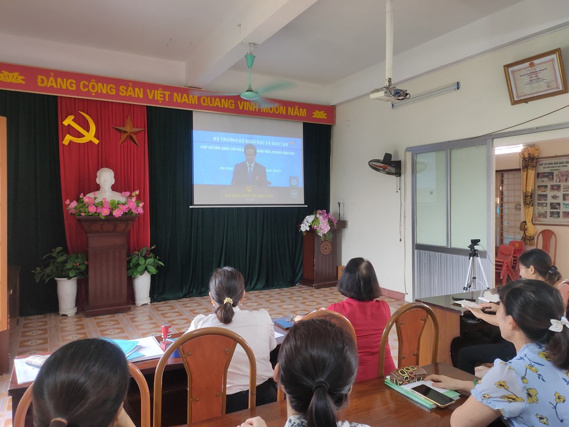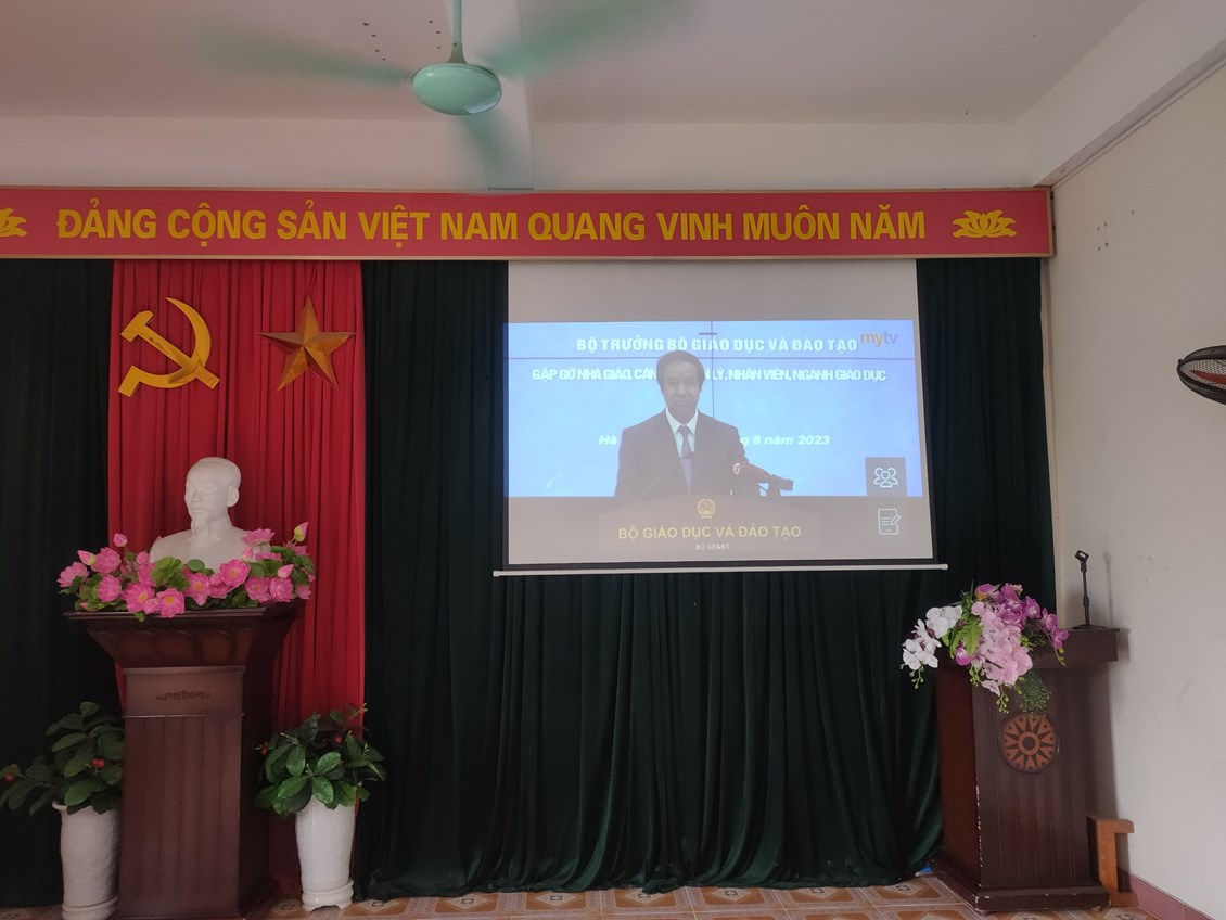Sáng ngày 15/8/2023 CBGVNV trường mầm non An Hồng được tham gia buổi đối thoại trực tuyến với bộ trưởng Bộ GD&ĐT về một số vẫn đề trăn trở mà CBGVNV trong ngành giáo dục nói chung, ngành giáo dục mầm non nói riêng muốn đề xuất với Bộ trưởng để giúp đội ngũ yên tâm công tác và cồng hiến hết mình cho sự nghiệp giáo dục của nước nhà