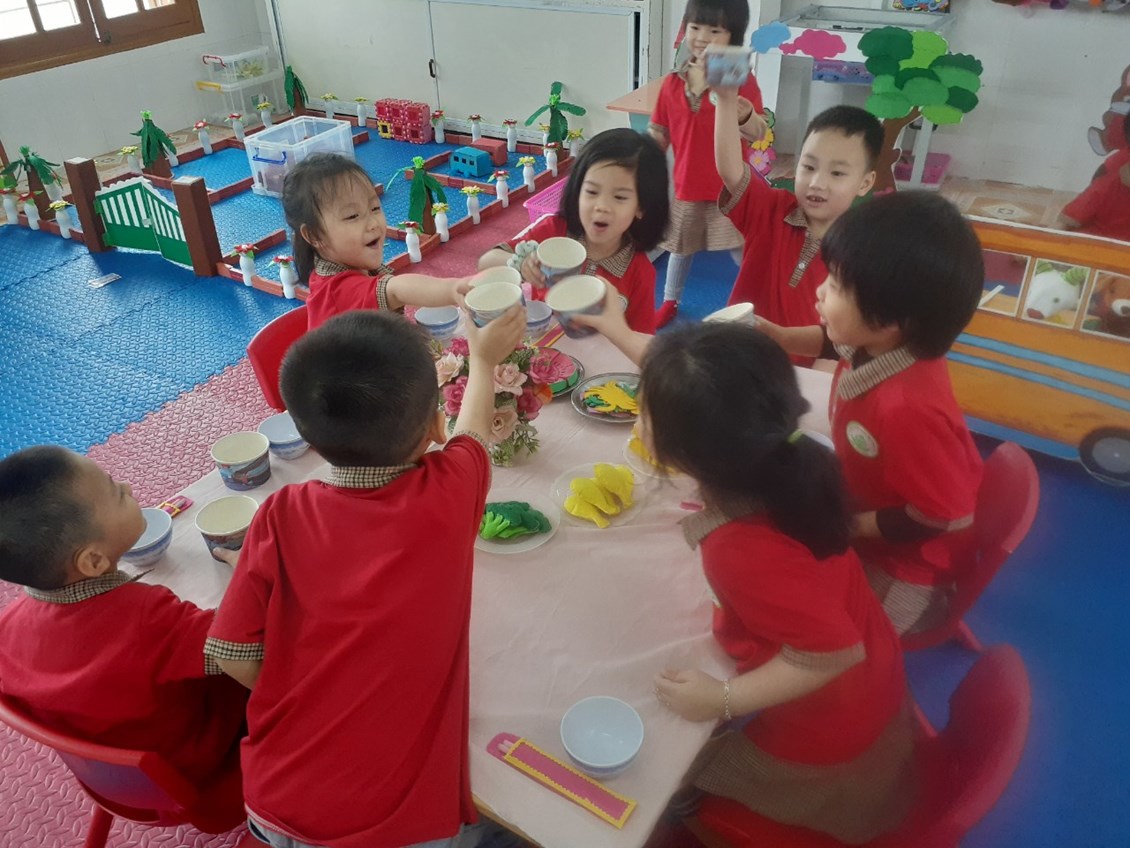 Trẻ đóng vai làm bác cấp dưỡng chế biến các món ăn, cùng nhau quay quần bên bữa tiệc vui vẻ.