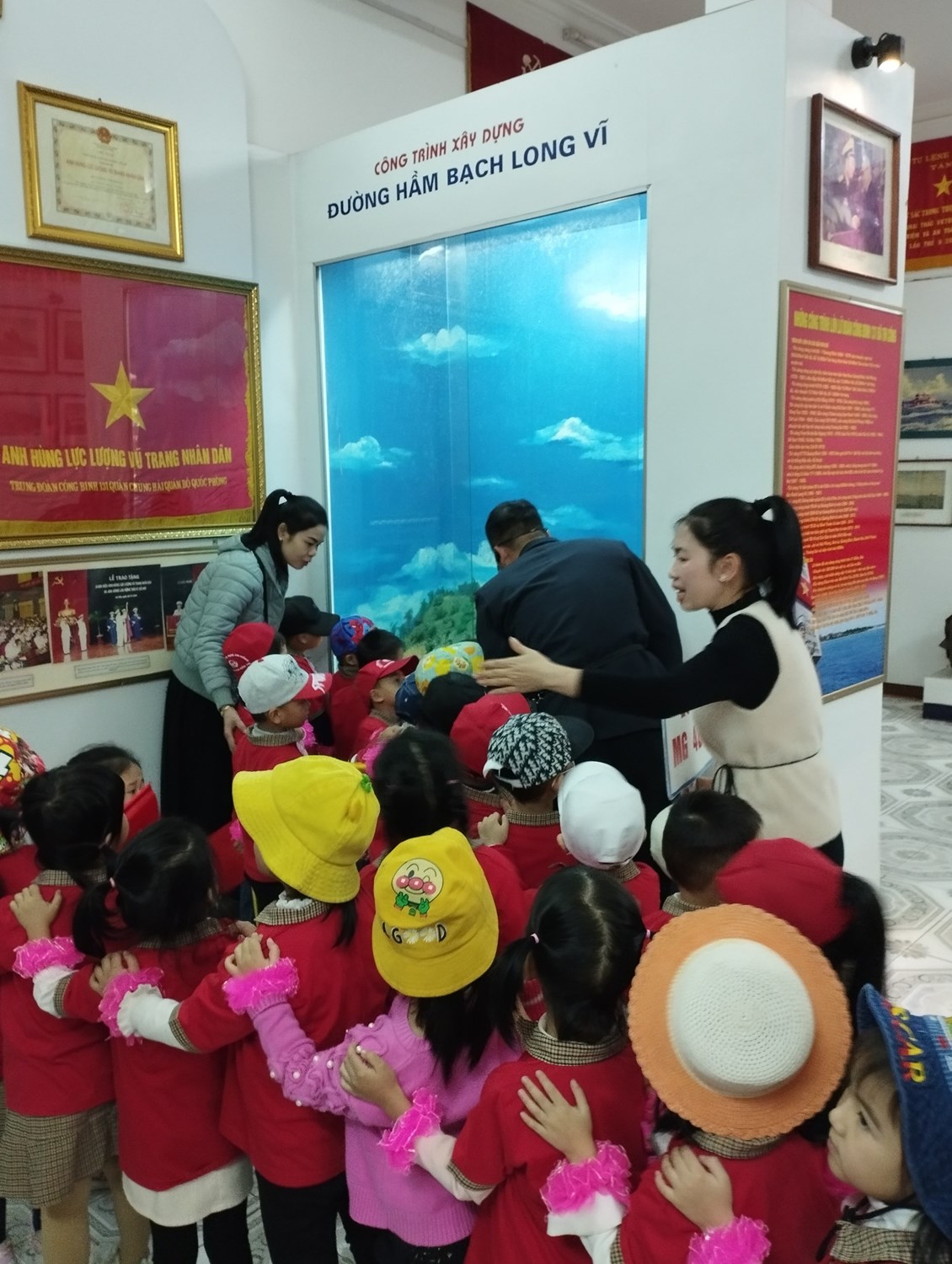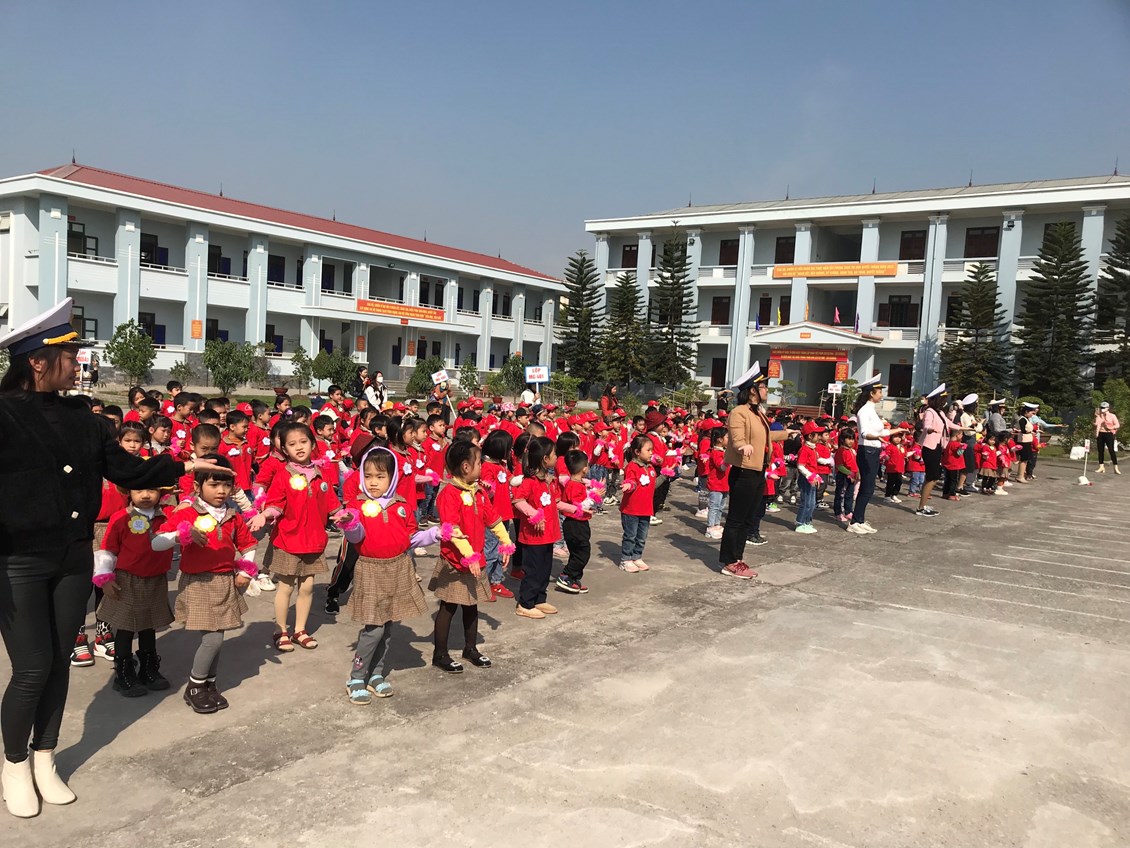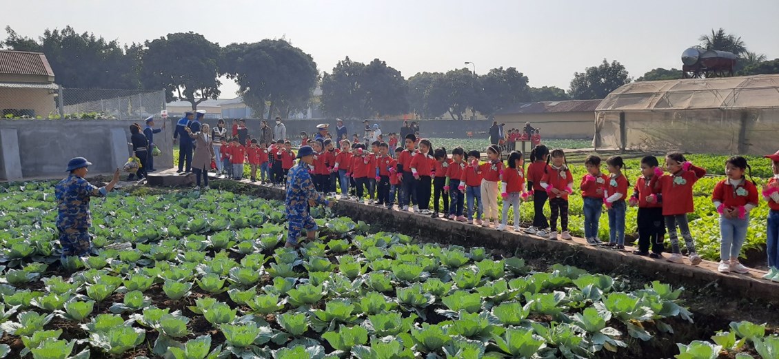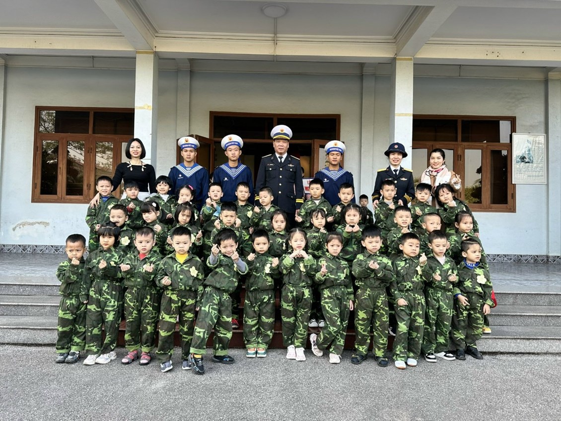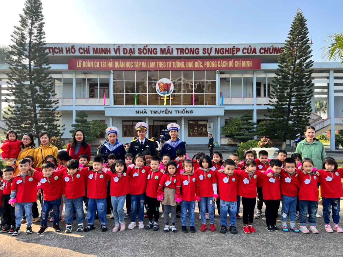 Bắt đầu buổi tham quan, cô trò đã được tham quan nhà truyền thống tại đay các bé được nghe Chú Bộ đội thuyết minh về các công trình được xây dựng trên đảo Trường Sa… Sau đó cô và trò giao lưu văn nghệ với các chú bộ đội: Hát múa những bài hát ca ngợi về các chú bộ đội. Trong buổi giao lưu, các bé được trò chuyện, giao lưu với các chú bộ đội, nghe kể về công việc đời sống sinh hoạt của các chú và cùng hát vang các bài hát ca ngợi về quê hương, đất nước, về chú bộ đội thân yêu. Mỗi tiết mục văn nghệ, mỗi lời ca, tiếng hát là những lời chúc thân thương của các bé giành cho các cô chú trong Lữ đoàn 131 – Tiểu đoàn 883.